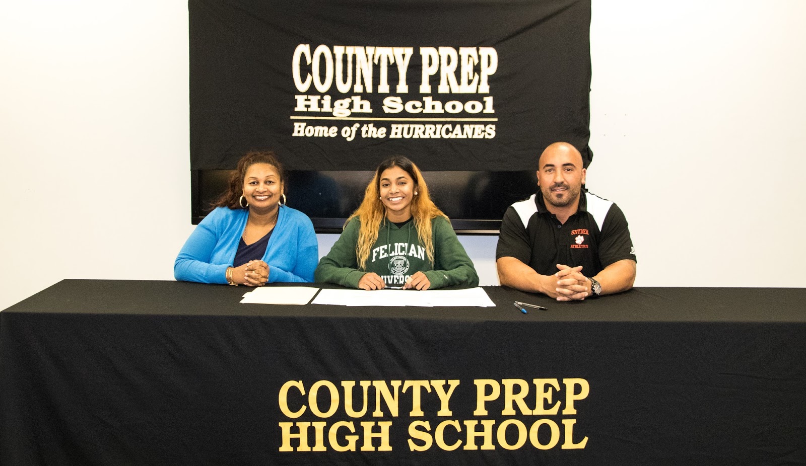 County Prep Senior Vanessa Saiboo has reached a goal that she set for herself as a young girl. Since the age of seven she has been running cross country track and is now looking forward to running on the collegiate level. This month Vanessa signed with Felician College to be part of their Cross Country Track and Field Team. She has received both academic and athletic scholarships to attend Felician College on a full ride. Pictured here are Vanessa’s mom, Ishwattie Saiboo, and her Snyder High School Track & Field coach, Robert Arena, who were present for the signing. This season Vanessa is #4 in the State for Steeplechase and #1 in Hudson County for Steeplechase; she also broke Synder High School’s record for Steeplechase. Principal Ms. Barbara Mendolla and the entire County Prep community congratulate Vanessa on her accomplishments and wishes her well on her new endeavors.
